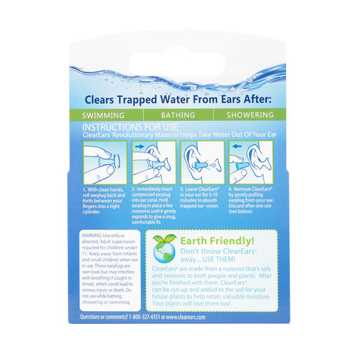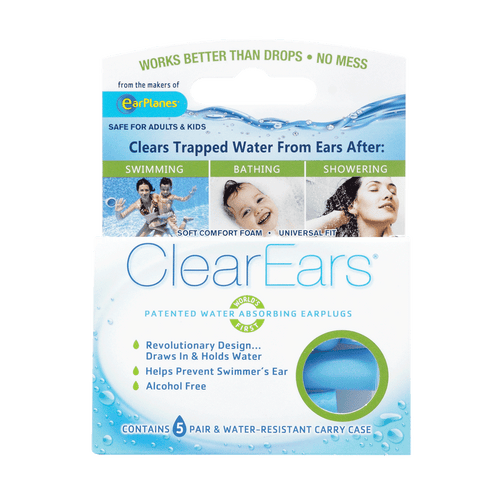 The revolutionary product, ClearEars, is a soft, comfortable earplug containing a FDA approved polymer which draws water from the ears.
